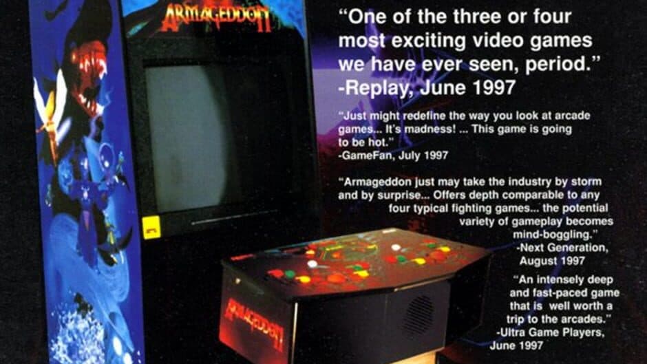Magic: The Gathering: Armageddon is an extremely rare arcade game published by Acclaim in 1997, somewhat similar to BattleMage. It is possible that as few as four machines were made. Acclaim's Mountain View, California-based coin-op division went out of business shortly after creating the game, so it never went into full production. GamePro reported that Armageddon was shown to their editors behind the scenes at the 1997 ASI show in Las Vegas, but did not appear on the show floor.The arcade board used 3dfx components and included 600 MB of RAM.