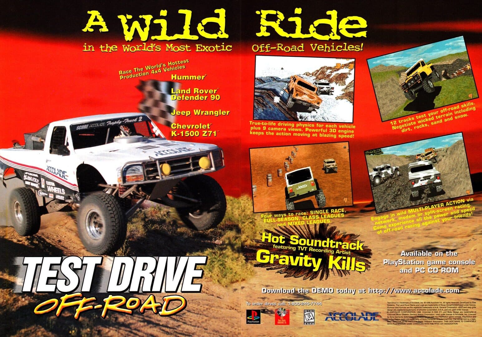 It's time to wander off the beaten path with Test Drive Off-Road, the first off-road racing game in the popular driving series. Players can hit the road with one of four licensed 4x4 vehicles, each rated in speed, handling and acceleration: a Hummer, Land Rover Defender 90, Jeep Wrangler and Chevrolet K-1500 Z71.